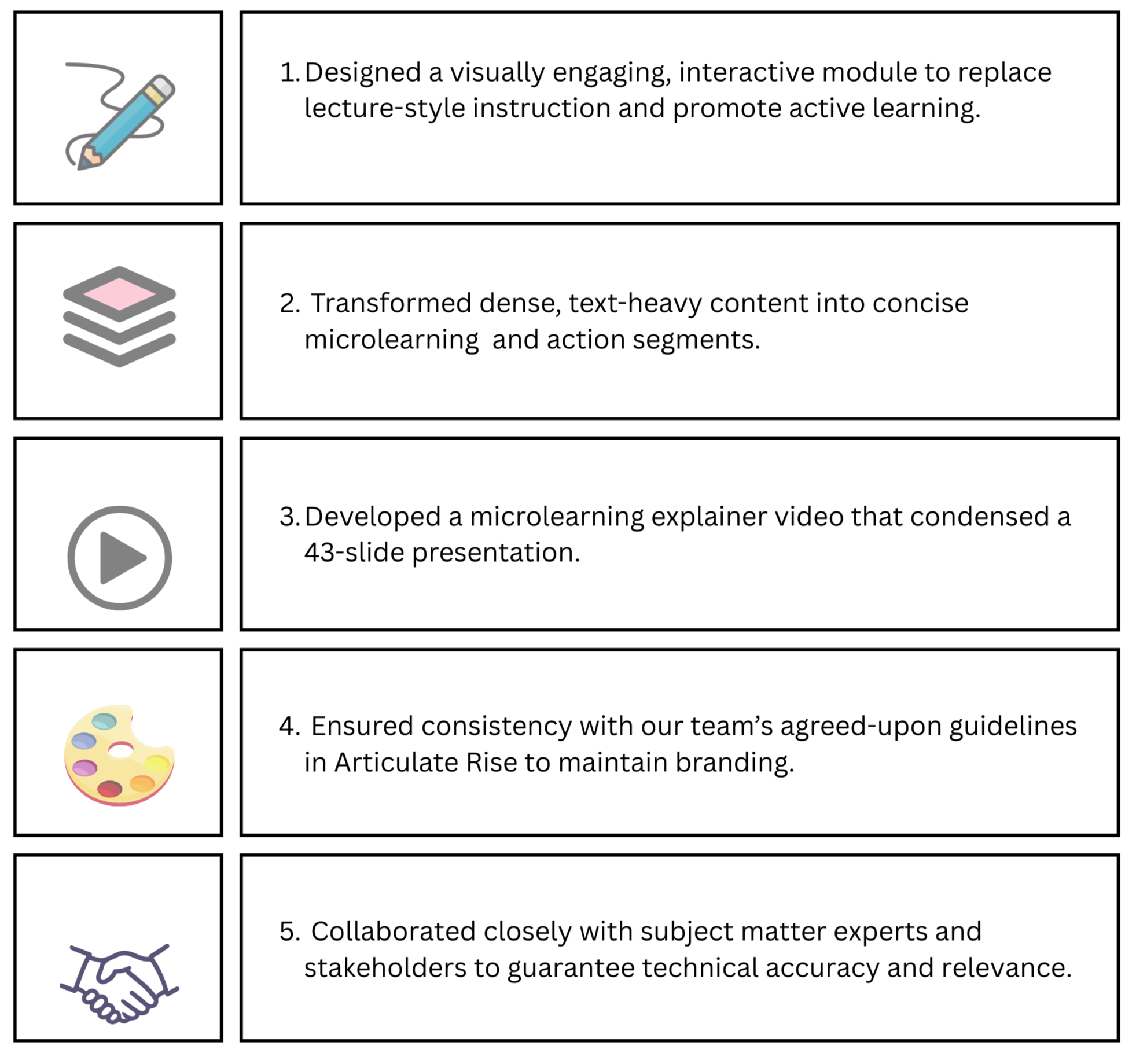 To move beyond lecture-style instruction, I designed a visually driven learning experience focused on active engagement. This approach helped learners grasp and confidently apply complex concepts.